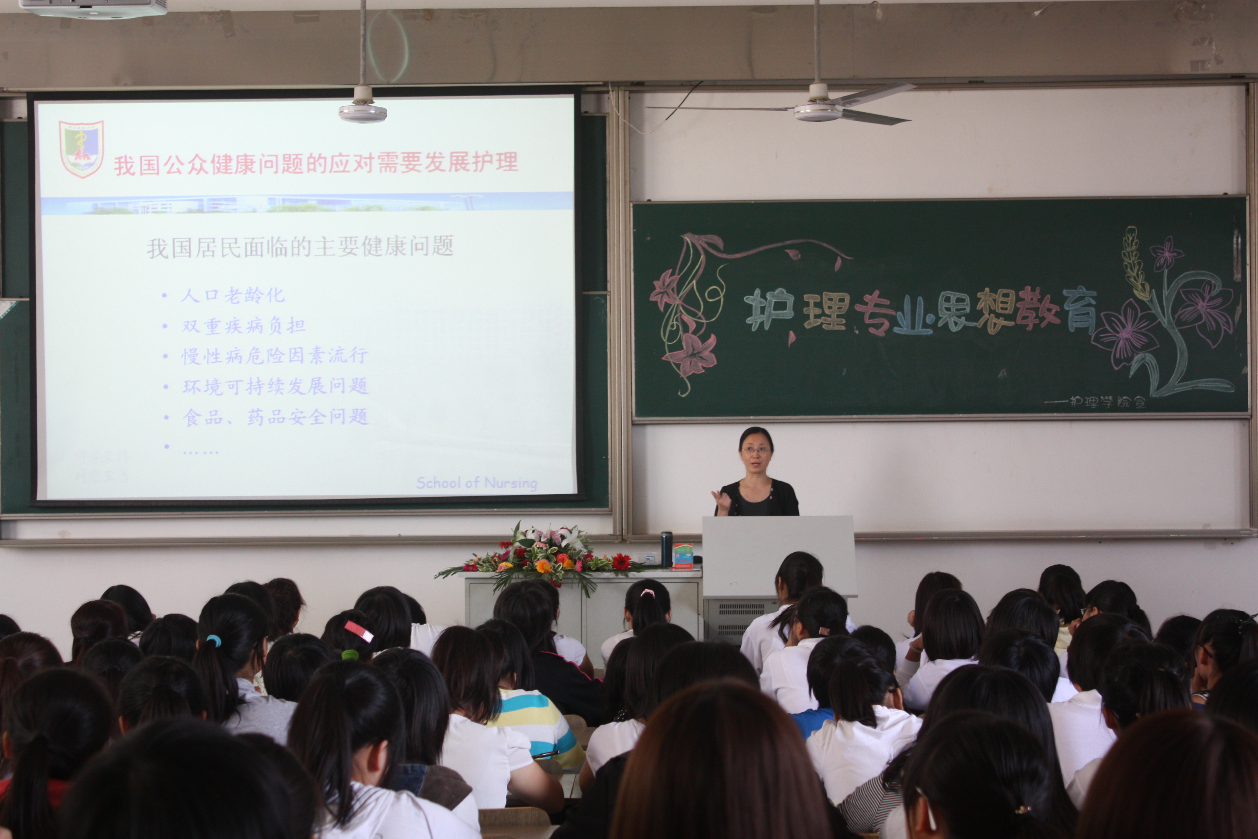 在满座新生们期待眼神的注视下,徐晔星老师介绍了本次课主讲崔焱院长。而崔院长刚走上讲台,便提出“护理学是什么”这样一个问题,引发同学们的思考,接着指出它是健康学科中最重要的学科之一,她亲切幽默的讲述引发同学们阵阵笑声。同时也描述了护理现状与发展趋势,俗话说,“居安思危,思则有备,有备无患”,对于刚刚进入梦想中殿堂的同学们来说,这样的讲述无异于一个温和而不失威力的炸弹,同时我国人口健康问题现状——老龄化、慢性病等问题也让同学们眉头染上忧虑,接着崔院长深入浅出地说明了护理学任务及护士扮演的各种角色,让同学们深感肩头责任重大的同时涌起一股自豪感。南丁格尔的生平事迹点亮了同学们护理生涯中的第一盏明灯,坚定了学好护理的决心。适时地,崔院长解释了我校的办学理念——“医学与人文融通、教育与科研并重、基础与应用结合”,并介绍了我校九游娱乐(JIUYOU)官方网站_9YOU GAME规模,特别说明了优秀的师资队伍和专业情况,极大地提升了同学们学好护理的信心。最后,崔院长提出了九游娱乐(JIUYOU)官方网站_9YOU GAME学生的培养目标,表达了对同学们深深的期望之情。“博学慎行,明德兼爱”便是其最高准则。
