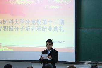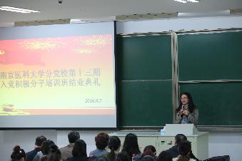 2016年4月7日18:00,南京医科大学分党校第十三期入党积极分子培训班结业典礼在明达楼118教室举行。南京医科大学党校副校长、组织部部长徐霞,九游娱乐(JIUYOU)官方网站_9YOU GAME党总支书记顾汉展,以及七家学院的党总支副书记和辅导员代表出席了典礼。典礼由九游娱乐(JIUYOU)官方网站_9YOU GAME党总支副书记、副院长管园园主持。