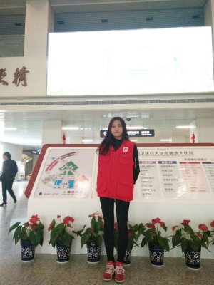 还有一对家长抱着孩子问志愿者孩子抽血是在哪里,志愿者说在二楼并带他们过去。期间那位爸爸问志愿者是不是南医大的学生,志愿者说是,他说他是药科大的老师,当时想争取医院的这个志愿没争取到。志愿者当时就觉得非常自豪,才知道这个志愿活动也是要努力争取的。当志愿者把他们带去检验科时,他们一直在说谢谢,志愿者说这是应该的。但是心里还是非常高兴自己能帮到别人。