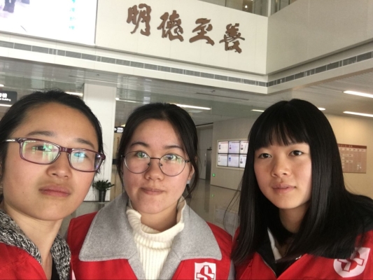 早晨8点,三位同学准时达到了医院,在指导老师王丽萍的安排下,三位同学被分到了三个地点,分别是于铃同学在大厅担任向导和帮助就诊的人挂号等工作,徐佳丽同学在心电图室,王敏贤同学在检验科帮助化验拍片的人拿取化验单等工作。