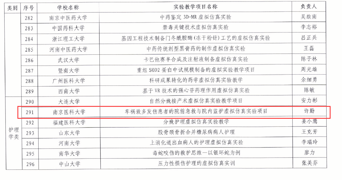 其中,护理学类共有来自全国25个项目参选,最终7个项目入选2018年度国家虚拟仿真实验教学项目。我院自主设计的“车祸致多发伤患者的院前急救与院内监护”项目作为江苏省唯一的护理类项目成功入选。