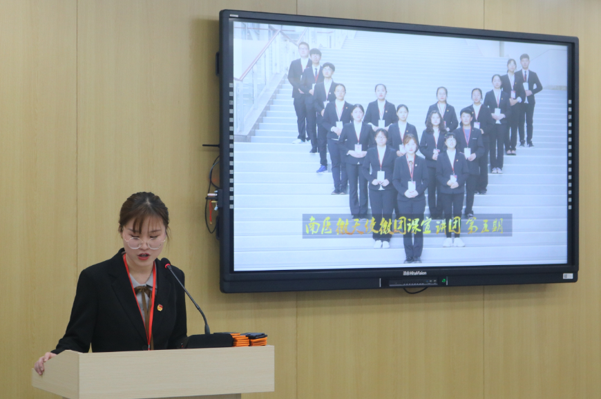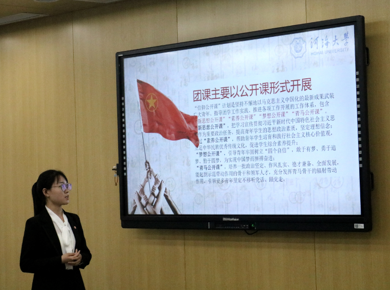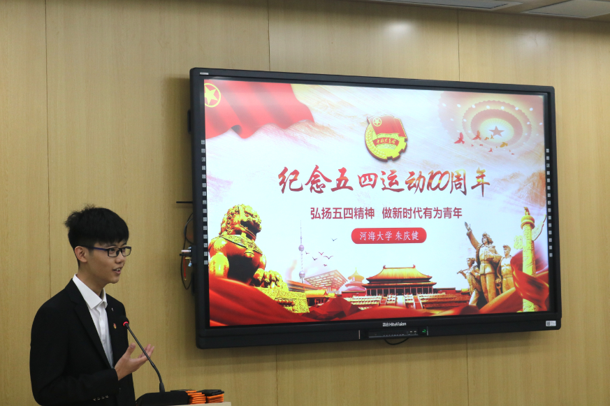 接着,王胜景同学作为团干部代表做了关于河海大学理学院团学活动开展情况的介绍。随后,河海大学理学院朱庆健同学为大家上了一节主题为“纪念五四运动100周年——弘扬五四精神、做新时代有为青年”的团课。他向大家介绍了五四运动的发起背景与意义。站在历史的宏观角度,向同学们讲解了“爱国、进步、民主、科学”的五四精神,并号召两院青年坚持新时代中国青年运动正确方向,争做新时代有为青年,奋力谱写实现中华民族伟大复兴中国梦的壮丽青春篇章。
