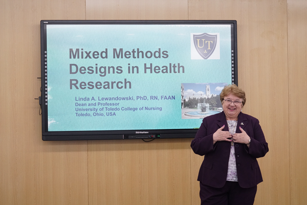 Linda A. Lewandowski教授主要介绍了质性研究和量性研究的区别以及质性研究的优势,通过分享自己在做质性研究时的点滴心得以及这些经历带给她的经验体会,为同学们讲述了质性研究和量性研究结合的三种混合式设计的具体方法。主要是三种核心设计,The Convergent Design、The Explanatory Sequential Design、The Exploratory Sequential Design,教授还讲解了三种设计的各自应用范围。