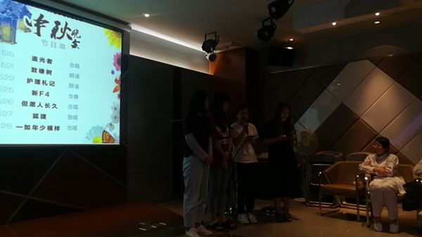 熟悉的乐曲响起,此次中秋晚会也正式拉开了帷幕。同学们以宿舍为单位准备了7个节目,包括独唱、合唱、朗诵、合舞等各种形式。515宿舍同学合唱的《追光者》象征着朝气蓬勃的护理同学们对继承护理之光的追求,在521宿舍同学抑扬顿挫的朗诵《致橡树》中,大家可以感受出女生们对当代女性职业平等、婚姻平等的坚持;《护理札记》更是让同学们明白作为一名护理工作人员应谨记的点滴,刘晓康同学的一首《狐狸》将晚会的氛围推向最高潮,老师同学们纷纷鼓掌;无论是合舞《新F4》还是合唱《一如年少模样》《开心往前飞》都显示出护理同学们无论走多远,依旧洋溢着热情,快乐、青春、活力,就如刚开始踏进护理这门行业时那般模样。