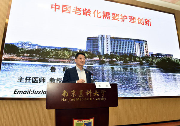 论坛伊始,由南京医科大学党委常委、副校长、附属逸夫医院院长鲁翔教授做了《中国老龄化需要护理创新》主题报告。