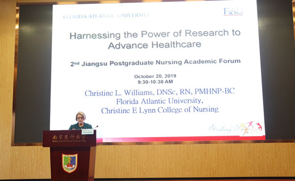 随后,来自美国佛罗里达亚特兰大大学(Florida Atlantic University)的Christine Williams教授带来讲座《Nursing Leadership: Claiming the Future of Healthcare Through Research》,由在读博士陈申同学担任翻译。Christine Williams教授主要讲述了护理领导力在护理工作中的重要性。她用耐人寻味的中国护士的故事阐述了护理教育长期以来的发展趋势,以多个例子说明由于护理者的教育背景、生活经历以及文化等的差异,不同的领导者会有多种不同的领导方式。她还指出,护士应具备批判性思维及创造能力,将研究证据运用于实践。她鼓励同学们攻读护理学博士学位并积极开展循证护理工作。她认为,领导者应挖掘团队潜力,激励团队分享愿景、发挥创造力,勇于面对挑战,引领整个队伍不断前进。最后,她还强调了利用科研的力量来推动医疗保健将成为我们护理人员义不容辞的责任。