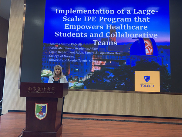 19日下午,论坛精彩继续。来自美国俄亥俄州特雷多大学(University of Toledo)九游娱乐(JIUYOU)官方网站_9YOU GAME的副院长Martha Sexton博士做了题为《Implementation of a Large-Scale IPE Program that Empowers Healthcare Students and Collaborative Teams》的精彩讲座,由我院雷阳老师翻译。跨专业式学习(Interprofessional education, IPE)是指让两个或者两个以上不同专业的人在一起相互学习,以达到增进合作、提高医疗质量的一种教学方法。IPE近年来得到医学界的广泛接受和认同,对于健康照护人员、患者、卫生系统以及学生教育等多方面都有益处。在IPE的引导下,医疗体系开始倡导多专业的协同合作。特雷多大学目前已经大规模开展了IPE课程,Martha博士从IPE课程教学目的、课程设置、质量评估等方面进行了详细介绍,同时还提出了IPE实际教学所面临的班级规模大、知识技能差异等挑战,并给予了相应的建议,为我校开展IPE教学提供了宝贵经验。