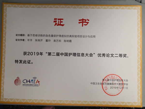 陈明霞在护理分会第二届中国护理信息大会上应邀作“基于思维训练的急危重症护理虚拟仿真实验项目设计与应用”的论文交流,向与会代表分享九游娱乐(JIUYOU)官方网站_9YOU GAME近年来在情景模拟教学方面取得的成绩,获得与会老师的热烈反响,并荣获优秀论文二等奖。这是九游娱乐(JIUYOU)官方网站_9YOU GAME在全国的护理信息会议上第二次展示情景模拟教学,彰显了南医护理人不断深化教育改革创新,积极探索新的教学理念和教学方法,在兄弟院校中起到示范作用。