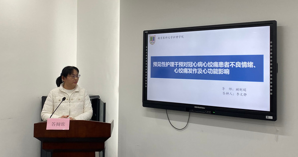 答辩伊始,主席介绍答辩委员会成员,导师介绍研究生基本情况,秘书汇报答辩论文概要及论文评审结果。接着,两位硕士研究生分别进行答辩汇报。崔佳佳从论文背景、内容、研究方法、研究结果、研结论等几个方面详细论述了论文《基于临床真实情境下的PBL在护生实习教学中的应用研究》。李文静从论文的研究背景、研究目的、研究意义、技术路线、研究对象、研究方法、讨论等几个方面仔细解读了论文《预见性护理干预对冠心病心绞痛患者的不良情绪、心绞痛发作及其心功能的影响》。之后,答辩委员会就论文内容提出了相关问题,在听取了研究生的回答后,答辩委员会就研究流程的规范、研究方法的选择、论文的书写格式、研究设计的完善等方面,提出了指导性修改意见及建议。