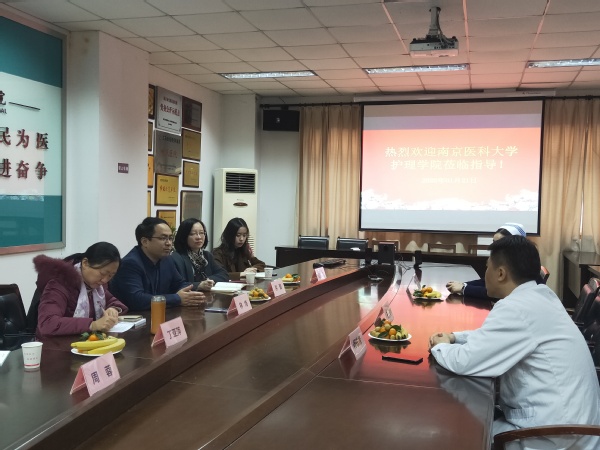 2020年1月21日上午,学院林炜书记、许勤副院长、丁亚萍副院长等一行5人赴南京医科大学社区卫生实践教学基地——新街口社区卫生服务中心(玄武医院)进行走访调研,玄武区卫健委副局长、新街口社区卫生服务中心院长王河、副院长杨轶青、护理部主任虞建花以及全体护理骨干参加。