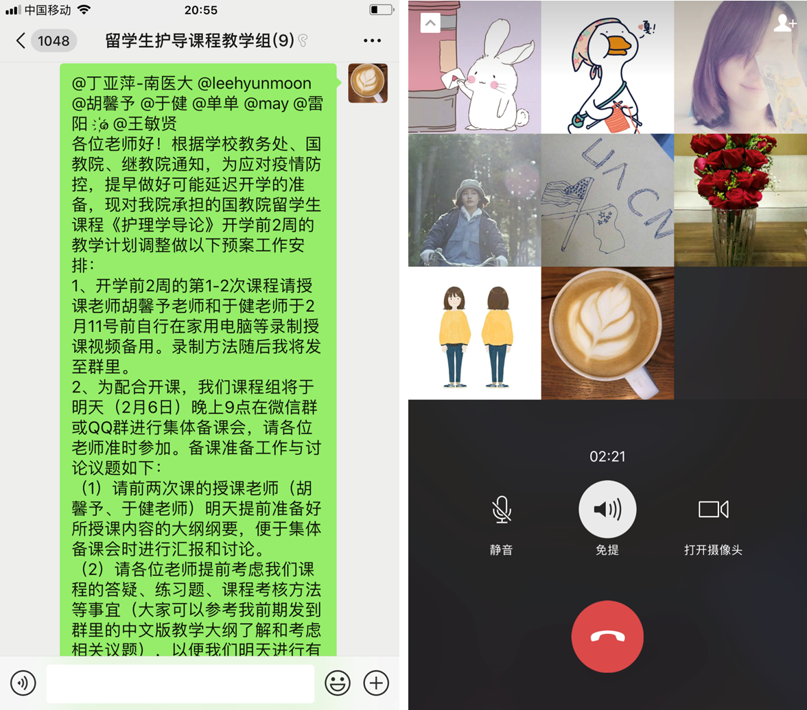 当前疫情形势下,为响应学校“停课不停学”的号召,执行好相关在线教学工作,我院基础与社区护理学系于2020年2月6日晚上09:00和2月9日上午10:00采用微信群方式分别召开了本学期国教院留学生课程《护理学导论》的第一次线上集体备课会和教师试讲。会议由课程负责人王洁老师主持,丁亚萍副院长以及承担该课程授课任务的李现文、雷阳、单恩芳老师、一附院的胡馨予和于健老师、助教王敏贤同学参加了集体备课会。两次线上集体备课会的主要议程包括:前四次理论课授课内容与纲要的梳理、课程考核方式的讨论与确定、前两次课授课教师的试讲。
