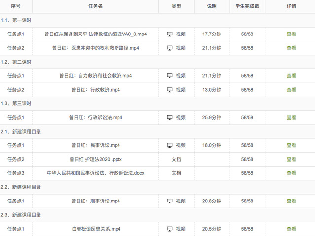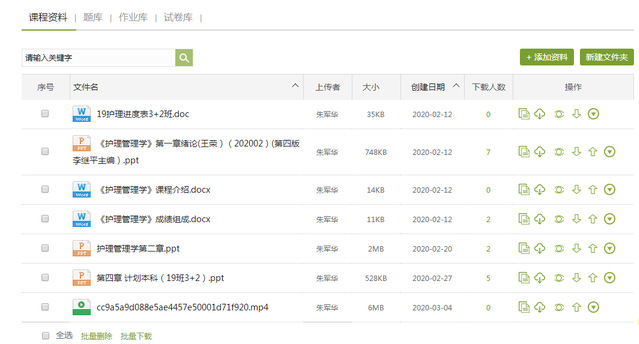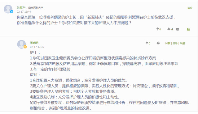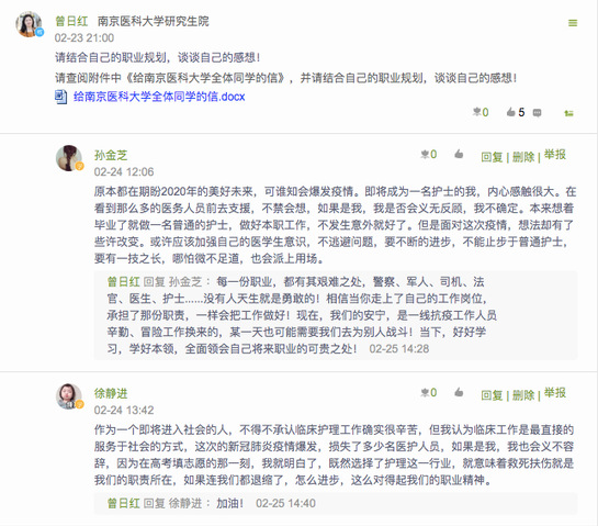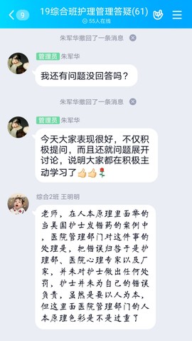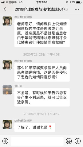 承担《护理管理学》教学任务的老师们大多来自于临床一线,包括一附院党办顾则娟主任、护理部王荣主任,科护士长田金萍主任等。打响疫情防控阻击战后,她们原本繁忙的工作更加忙碌,自春节以来就一直坚守在临床的最前线。工作间隙坚持努力备课,认真完善教学资料,同时用丰富的临床阅历与经验为同学们答疑解惑,保质保量地完成在线教学任务。《护理伦理与法律》课程特邀马克思主义学院曾日红老师为同学们在线授课。授课期间,曾日红老师先后亲自录制教学音频上传至超星平台、挑选中国大学MOOC中精品课程供学生学习。此外,还通过申请卫法题库、安排典型社会公共事件讨论等不同方式以此来增强课程实践性。同时,研究生助教也积极投入到课程的管理和建设中,协助课程老师发放通知、资料上传、作业批改、学生意见反馈等。至此,两门线上课程在师生们的共同努力下得以顺利开展,也收获了同学们的肯定。