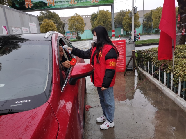 作为一名社区站岗志愿者助力社区,为进出的居民用体温枪测量体温。
