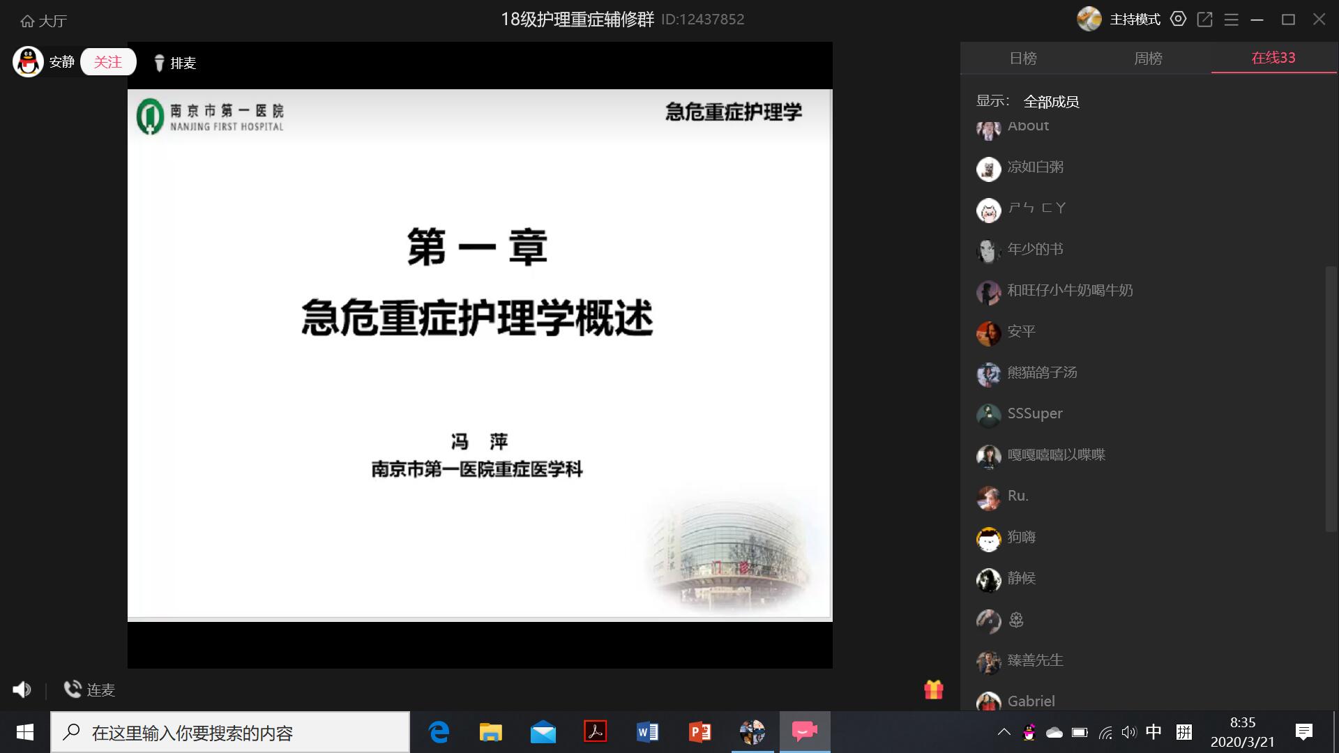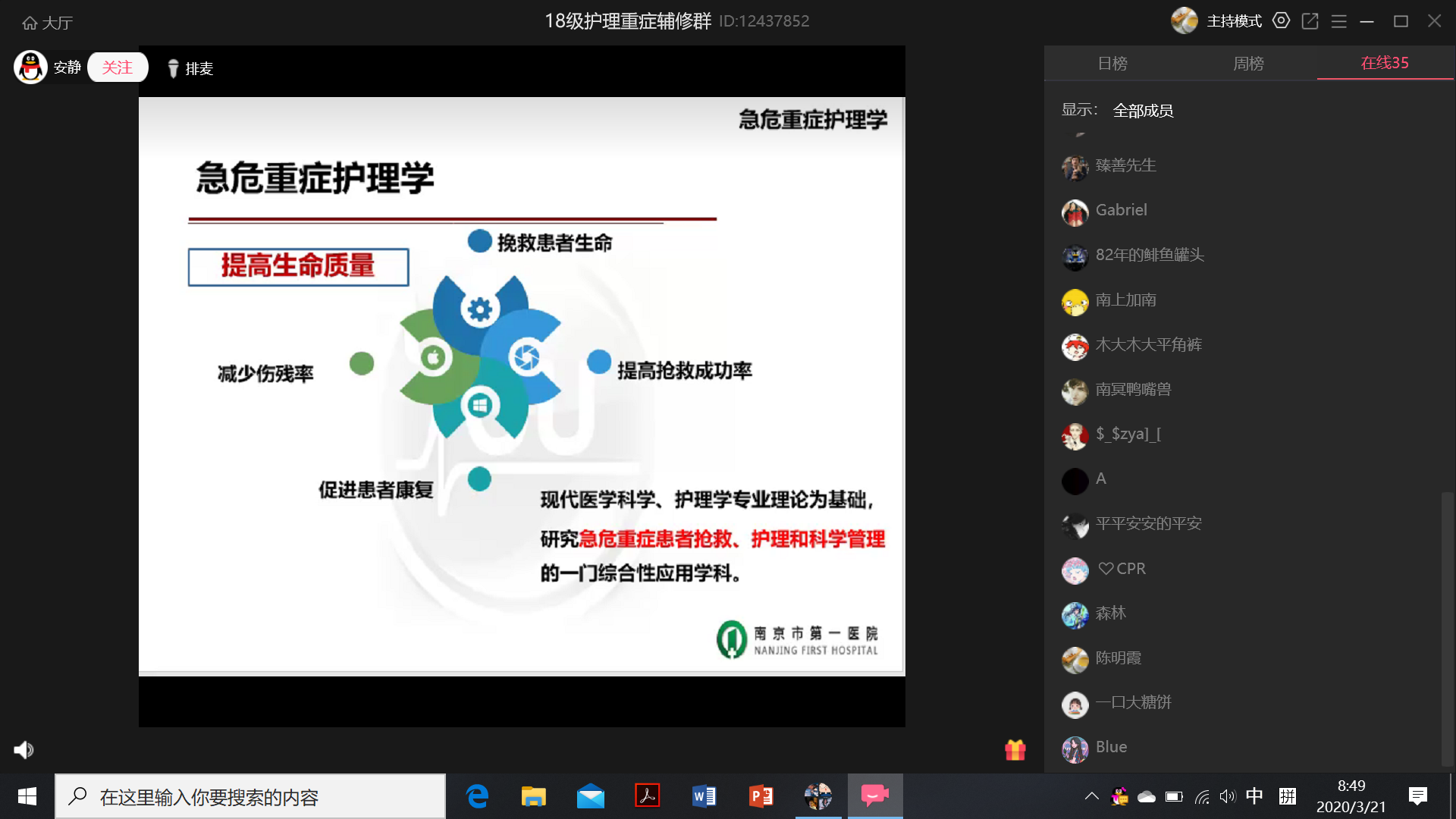 课程第一讲从附属南京医院ICU护士长冯萍老师主讲的《急危重症护理学概述》开始,35名辅修同学参加了本次线上课堂学习,学院丁亚萍副院长和部分课程老师参加了课堂跟课。依托QQ群直播功能,通过上课前提醒、课前签到、跟课、适时提问及课后及时交流等方式,顺利完成第一次理论课课程教学。同学们均反馈在这个特殊情况下老师们授课讲解详细,非常精彩,尤其在当前形势下,同学们充分认识到危重症护理方向的专业价值、重要性和意义;授课教师们也反馈此次教学给大家提供了新方法,也对如何保障教学效果提出了新的挑战。