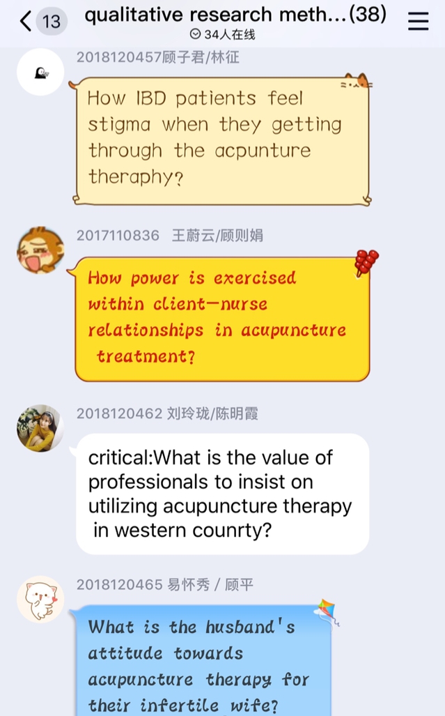 课程最后部分同学们进行了汇报展示,虽然每人只有短短的5分钟,但却将自身的收获与不足最大化地展现了出来,宇文教授进行了一一点评,并将共性问题进行了进一步解答,使大家对课程的知识点有了更牢固的掌握。最后,宇文教授通过自身的科研经历和课程内容,为大家讲解了质性研究在干预性研究中的应用,并为大家解答各自课题中遇到的问题,大家收获满满。