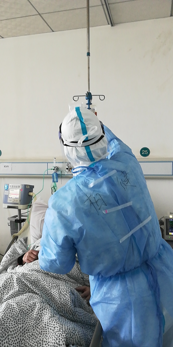 虽然工作强度和心理压力都比平时大,但柏健却乐在其中。在ICU工作五年的他有着丰富的重症护理经验,柏健的同事告诉记者,“他可是医院PICC(经外周穿刺置入的中心静脉导管)置入高手,在本院ICU工作时,几乎‘承包’了科室所有的超声引导下置管、床旁摄片定位等专业性操作,是新护士眼中的男神。”在黄石,呼吸机气道护理、CRRT(连续肾脏替代疗法)、俯卧位通气、气管插管、压疮预防、皮肤护理、功能性体位……无论是常规治疗还是新增疗法,柏健都能做到游刃有余。在他和同事的护理下,没有一位患者出现压疮等并发症。“对我来说,这是一次特殊的经历更是一次历练和成长。在为患者进行俯卧位通气的过程中,工作量巨大,非常耗费体力,在保证患者安全的前提下,通常需要五个人才能完成这项操作,每次做完全身都会湿透,但我一点都不觉得累,为了患者能尽早出院,我认为一切努力都是值得的。”柏健说。