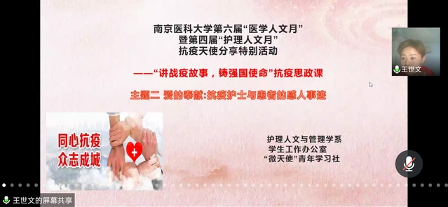 为响应“共抗疫情,爱国力行”主题教育活动,分享抗疫先进、典型事例,弘扬爱国主义和护理专业精神,护理人文与管理学系以“传承专业精神,彰显护理风骨”为主题,开展第四届“护理人文月”抗疫天使云分享暨“讲战疫故事,铸强国使命”抗疫思政课特别活动。5月12日晚7点,学院邀请第一附属医院胸外科团支部书记/护师王世文进行第二次分享活动。活动前期,同学们积极报名,最后有近240位同学参与了分享活动。分享会由“微天使”青年学习社社长刘思辰同学主持。