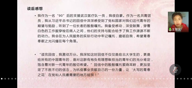 会议伊始,王老师讲述了出征前的准备工作,到达武汉整建制接管武汉市第一医院重症病区后进行紧急培训,以及进舱前在防护服上写下医院、姓名等。绘声绘色的描述加上真切感人的照片,同学们仿佛能从中看到疫情下武汉的真实面貌。随后,她讲到对患者的护理工作,护理不仅仅针对生活护理,患者的情感需求也不可忽视。隔离期间,患者情绪低落,护理工作者与其进行交流,让他们与家人通电话,并设计文化墙来舒缓患者情绪。接着,王老师就静脉采血、大小便护理、测血糖、给患者喂饭四个方面进行举例,讲述了武汉工作中的感人瞬间。患者从开始的不配合到最后的积极配合并对医护人员表达感谢,每一个举动都充满了善意与温暖,诠释出了“隔离病毒,却不隔离爱”的人间真情。然后,她朗读了习近平给北京大学援鄂医疗队全体“90后”党员的回信,以及其他医务人员的书信,声情并茂,温暖、感动溢于言表。他们不是一座孤岛,一方有难,八方支援,或许出征时雪花纷飞,但归来时樱花已如约绽放。最后,王老师讲述了转战金银潭医院的日常工作以及系列活动,并分享了她隔离期间的日记,她说,春暖花开,不胜不归,感谢支援武汉的经历,也感谢那些可爱的人们。