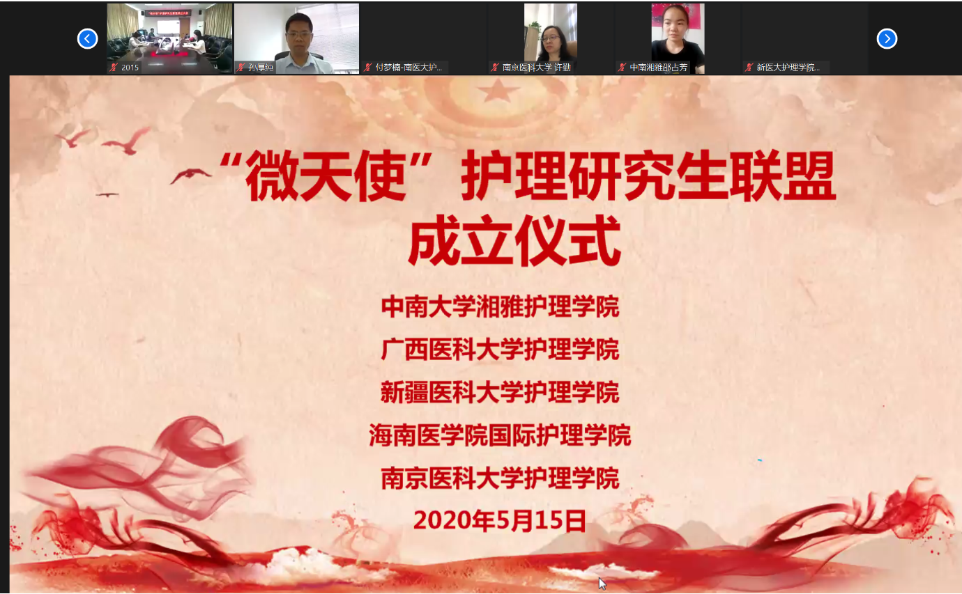 五月春风易暖,花海溢香,2020年5月15日,由中南大学、广西医科大学、新疆医科大学、海南医学院、南京医科大学五所院校的九游娱乐(JIUYOU)官方网站_9YOU GAME共同发起的“微天使”护理研究生联盟(以下简称联盟)云成立仪式如期举行。