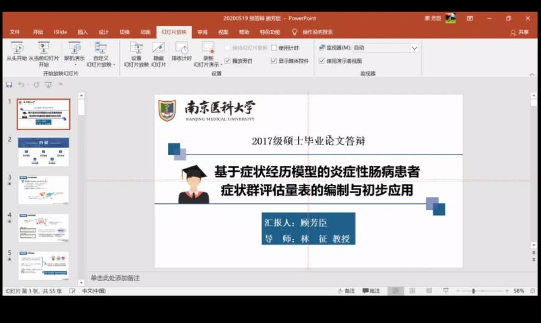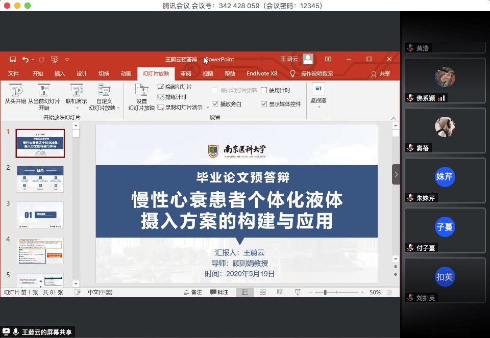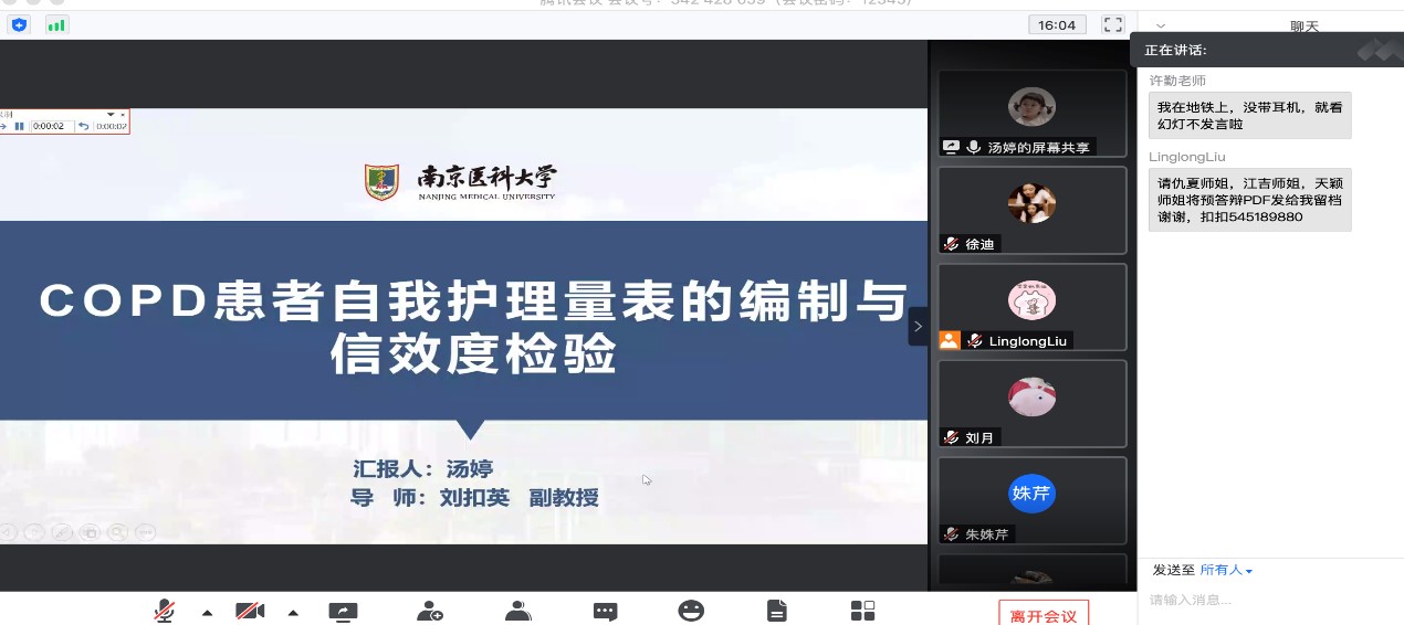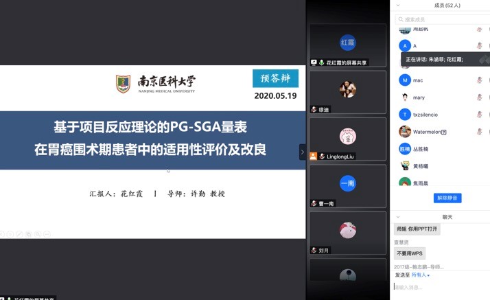 2020年5月19日下午14:00,我院临床护理学系、护理人文与管理学系2017级研究生预答辩通过网络平台进行,本次预答辩由朱涵菲,刘言,徐迪3位研究生主持,11位研究生参与了预答辩,与会指导老师有:孙国珍,顾平,季晨博,张燕红,顾则娟,杨如美,陈明霞,林征,刘扣英等,参与本次预答辩的师生人数共计52人。