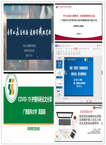 2020年7月24日,“微天使”护理研究生联盟举办线上抗击疫情主题论坛。中南大学湘雅九游娱乐(JIUYOU)官方网站_9YOU GAME、广西医科大学九游娱乐(JIUYOU)官方网站_9YOU GAME、新疆医科大学九游娱乐(JIUYOU)官方网站_9YOU GAME、海南医学院国际九游娱乐(JIUYOU)官方网站_9YOU GAME及九游娱乐(JIUYOU)官方网站_9YOU GAME在抗击疫情中具有代表性及特殊贡献的护理人参与了本次论坛,与五校研究生分享她们的抗疫经历,传递抗疫精神,展现护理风采。