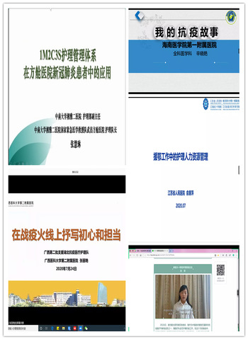 中南大学湘雅二医院护理部副主任张慧琳老师讲述了她在武汉的抗疫经历,并基于1M2C3S护理管理体系分享了她在武汉方舱医院的管理经验。广西医科大学第二附属医院风湿免疫科护士长、广西第二批支援湖北抗疫医疗队护理总队长张丽艳老师讲述了她支援一线的经历和感受,张老师的演讲深刻诠释了战疫火线上护理人的初心与担当。作为海南省支援湖北抗疫医疗队首批队员,海南医学院第一附属医院全科医学科护士长辛晓燕老师在前线发挥护理专业特长与管理经验,为遏制疫情发展提供莫大贡献。南京医科医科大学第一附属医院消化内镜、胰胆二病区护士长余惠萍老师分享了她在援鄂工作中的护理人力资源管理经验以及生活管理中的人文关怀,让与会研究生们体会到护理专业的专业度与护理人文的温暖度。由于新疆地区当下正处于疫情的攻坚与稳固阶段,新疆医科大学一附院护理部副主任、援巴基斯坦护理专家代表张莉老师再次投身前线疫情防控工作,遗憾缺席此次线上论坛,但她通过一段短视频向大家分享了她在巴基斯坦抗疫的经历以及管理感悟,体现了中国护理人在抗疫中的责任担当与大国风采。