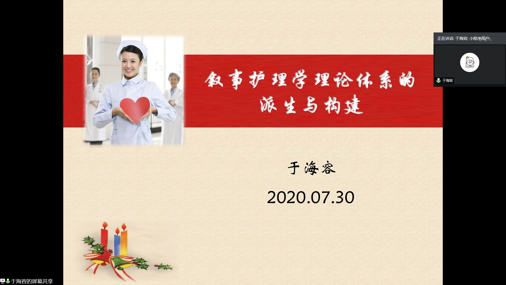 “叙事护理的理论与实践”分会场请到的主讲嘉宾是来自部队院校的于海容博士和来自南京医科大学附属肿瘤医院的程芳护士长。首先,于海容博士就叙事护理学理论体系的派生与构建进行了专题讲座。她从当前医学和护理面临的困境谈及叙事护理的由来,详细介绍了叙事护理理论体系的派生及构建过程、叙事护理理论内容、研究方法以及评价方式。接着,程芳护士长以叙事护理的临床实践为主题,以附属肿瘤医院叙事护理的开展历程及现况为例,分享了其在临床中的应用。她指出,现阶段的叙事护理仍处于初步探索的阶段,并提出了对未来的展望。两位专家的分享激发了听众的热情思考,老师们纷纷提出自己研究中的疑惑,线上会议聊天框中激荡着交流碰撞的思想火花。