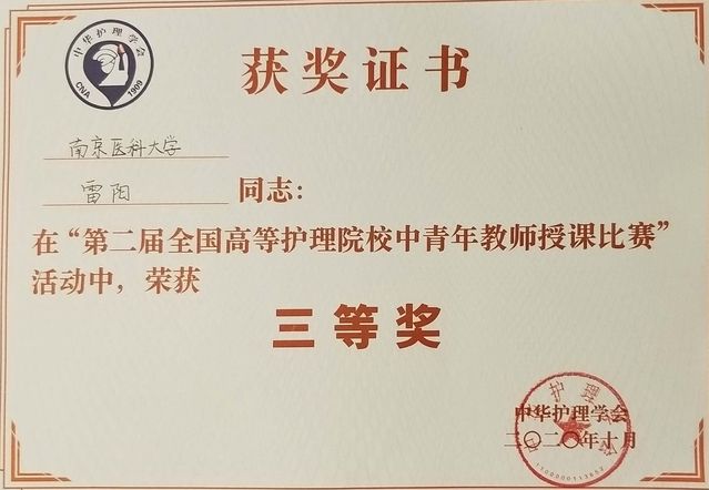 为建设高素质专业化创新型教师队伍,不断提高护理人才培养质量,促进医教协同背景下的教育教学改革,提高中青年教师教学能力与水平,推动护理教师队伍的可持续发展,中华护理学会于10月30日在福建厦门举办第二届全国高等护理院校中青年教师授课比赛,我院雷阳老师参加本次比赛并喜获三等奖。