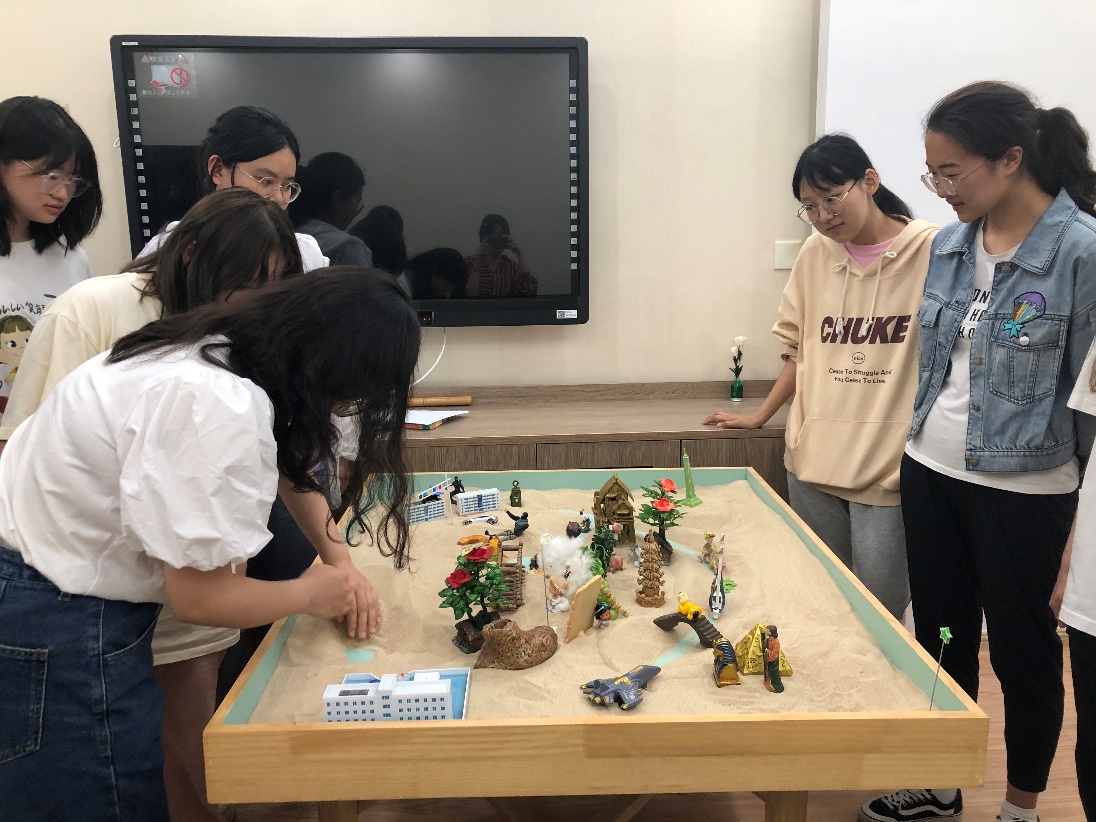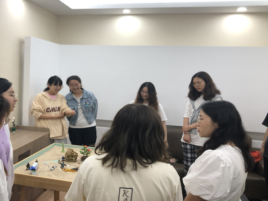 沙盘体验活动结束后,孟瑶老师与同学们进一步探讨了心理沙盘游戏团体辅导的知识、意义、经验和方法,为今后学生在工作岗位上的应用奠定基础。