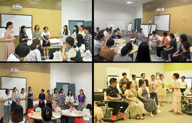为了让临床护理教学基地的老师们更好地理解与运用情景模拟教学,由张俊、汪璐、嵇艳、董玲等资深情境模拟教学师资团队用专题讲座与“工作坊”相结合的形式,对护理模拟教学的概念、课程要素与课程教学设计、教案编写与课程运行、教学评价、案例运行与引导性反馈等做了专题讲解。