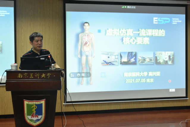 全国模范教师高兴亚教授在主题讲座《虚拟仿真一流课程的核心要素》中用丰富的动画、视频以ESP血压调节实验为例,生动阐述了虚拟仿真项目的实施原则与方法,展示了虚拟仿真在教学实践中的丰富应用。