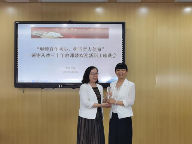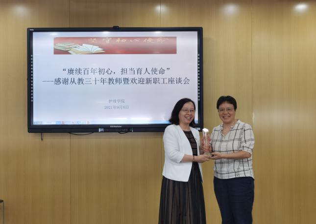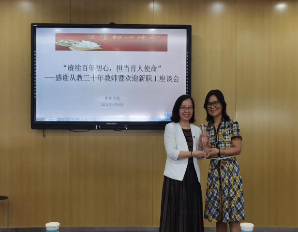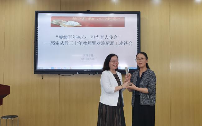 在第37个教师节来临之际,学院围绕节日主题“赓续百年初心,担当教育使命”,开展感谢从教三十年暨欢迎新职工座谈会。座谈会上宣读了满三十年教龄的老师名单:崔焱教授、许勤教授、林征教授、顾平教授、孙国珍教授和李新香老师。院领导为从教三十年的老师们颁发水晶纪念牌,感谢她们三十年的坚守和付出。学生代表们送上了对老师们的诚挚祝福和节日鲜花,对恩师们给予的教育和培养表示由衷感谢。从教三十年的老师们同切庆祝蛋糕,分享节日的喜悦和甜蜜。