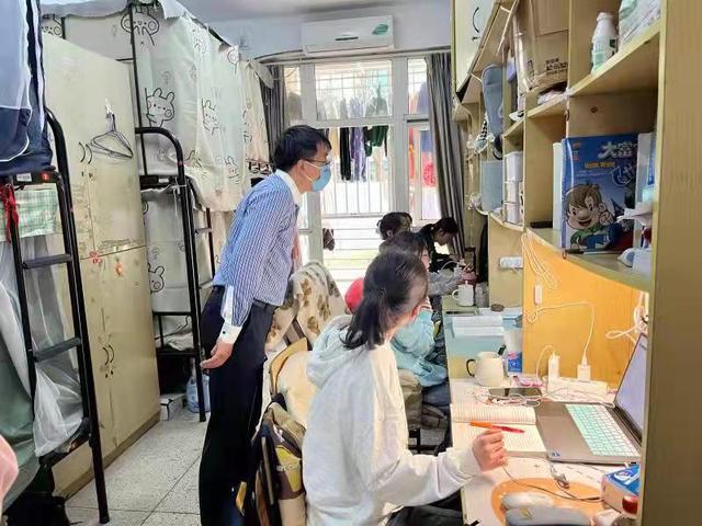 学院副书记、副院长苏益民带队走访慰问了21级本科生宿舍。同学们正在看教学视频或做随堂测试,自学《毛泽东思想和中国特色社会主义理论体系概论》的线上课程。苏老师询问了宿舍网络情况,鼓励同学们充分利用线上学习资源开展自主学习。