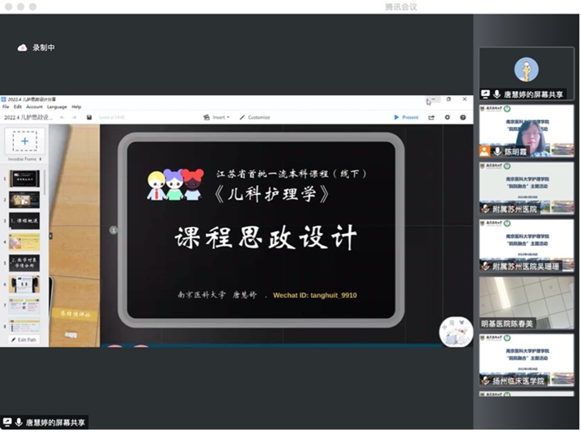 唐慧婷老师以《儿科护理学》为例,介绍了一门课程的思政设计与实施。在汇报中她首先针对课程思政设计思路进行了详细的解读。她指出应充分考虑授课对象的学情特点,结合国标、培养方案、各级思政教学指导文件综合进行课前的思政设计准备。并将课程中如何从LBL、CBL、高仿真模拟教学到临床见习,从课内的温润心灵到课外的社会服务,打造课程思政实现儿童健康促进的终极课程目标,向与会者做了详细的分享。