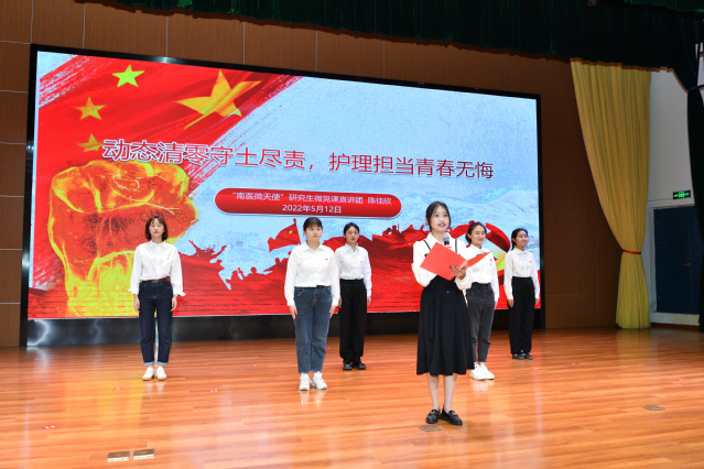 接着,研究生微党课宣讲团成员陈佳欣同学进行主题宣讲——《动态清零守土尽责,护理担当青春无悔》,陈佳欣同学从习近平总书记的讲话中领悟到青年的担当,并鼓励同学们牢记习近平总书记的殷殷嘱托,贯彻落实两会精神,传承南丁格尔精神,为全球健康做出应有的贡献。