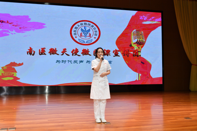 紧接着,南医微团课宣讲团蒋玉妍同学进行主题宣讲——《追寻白衣逆行之光》,她引用习近平总书记前日在庆祝中国共产主义青年团成立100周年大会上所说“‘清澈的爱,只为中国’已成为当代青年发自内心的强音。”以自身经历,讲述了护理这条路的不易,同时赞颂了护理人的责任、奉献与大爱精神。