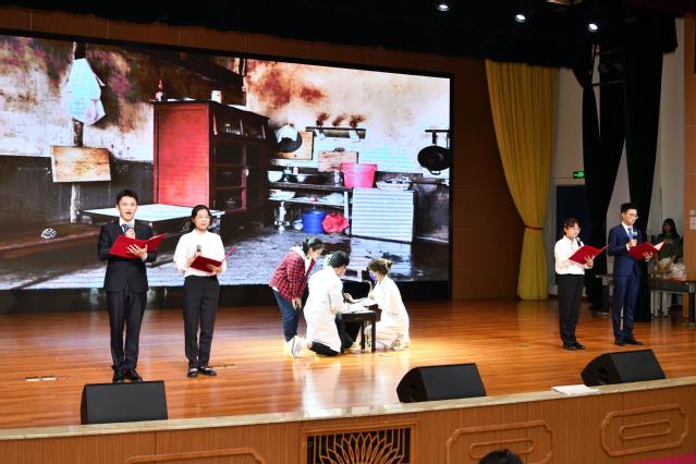 然后,曹梦芝、宗章浩、陈倩、郭翔宇四位同学带来音诗画朗诵《我赞美你,白衣天使》。朗诵时,由王逸笑等同学演绎情景剧:地铁救人的两位南医护理学子,参军入伍后脱下戎装重新穿上白大褂的学生、绽放在“高原孤岛”的南医“格桑花”达娃玉珍,体现了护理人的大爱。