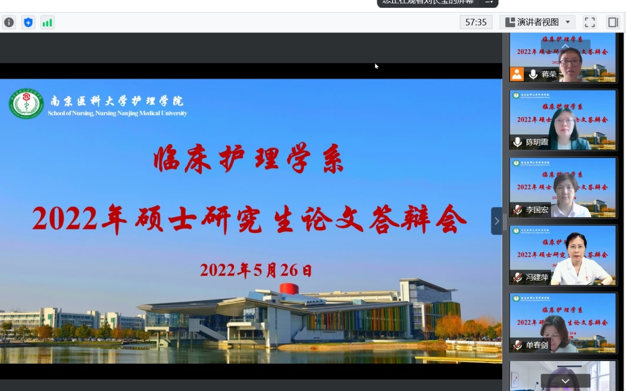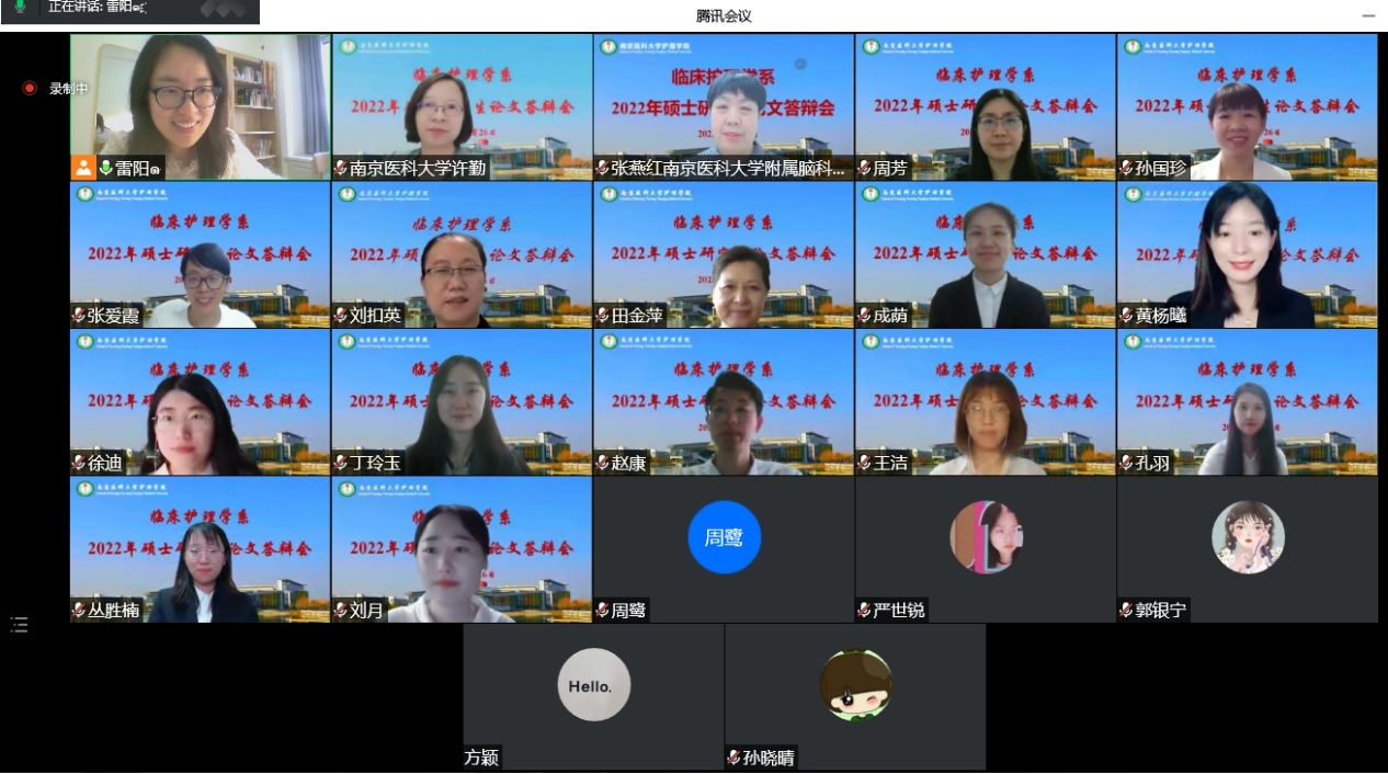 2022年05月26日下午,临床护理学系在线上举行了2022年研究生硕士论文答辩会。本次论文答辩会共18位硕士研究生参加,分为2个答辩组。东南大学附属中大医院原护理部李国宏主任、徐州医科大学九游娱乐(JIUYOU)官方网站_9YOU GAME副院长周芳教授任答辩主席,许勤教授、林征教授、孙国珍教授、顾平副教授、季晨博副教授、洪琴副教授、陈明霞副教授、刘扣英副教授、冯建萍主任护师、单春剑主任护师、张燕红主任护师、张爱霞主任护师、田金萍主任护师、程芳副主任护师任答辩委员,雷阳老师、蒋荣老师任答辩秘书。