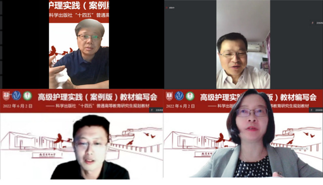 2022年6月2日晚19点30分,科学出版社“十四五”普通高等教育研究生规划教材《高级护理实践(案例版)》编写工作会议在线上召开,共有来自南京医科大学、南京大学、东南大学、江苏大学、南通大学、扬州大学、徐州医科大学、温州医科大学等院校及相关附属医院的19位编写人员出席。会议由我院党总支陈龙书记主持,科学出版社高等医学教育出版分社首席策划胡治国老师、我校研究生院吴文明副院长参加会议并给予致辞。