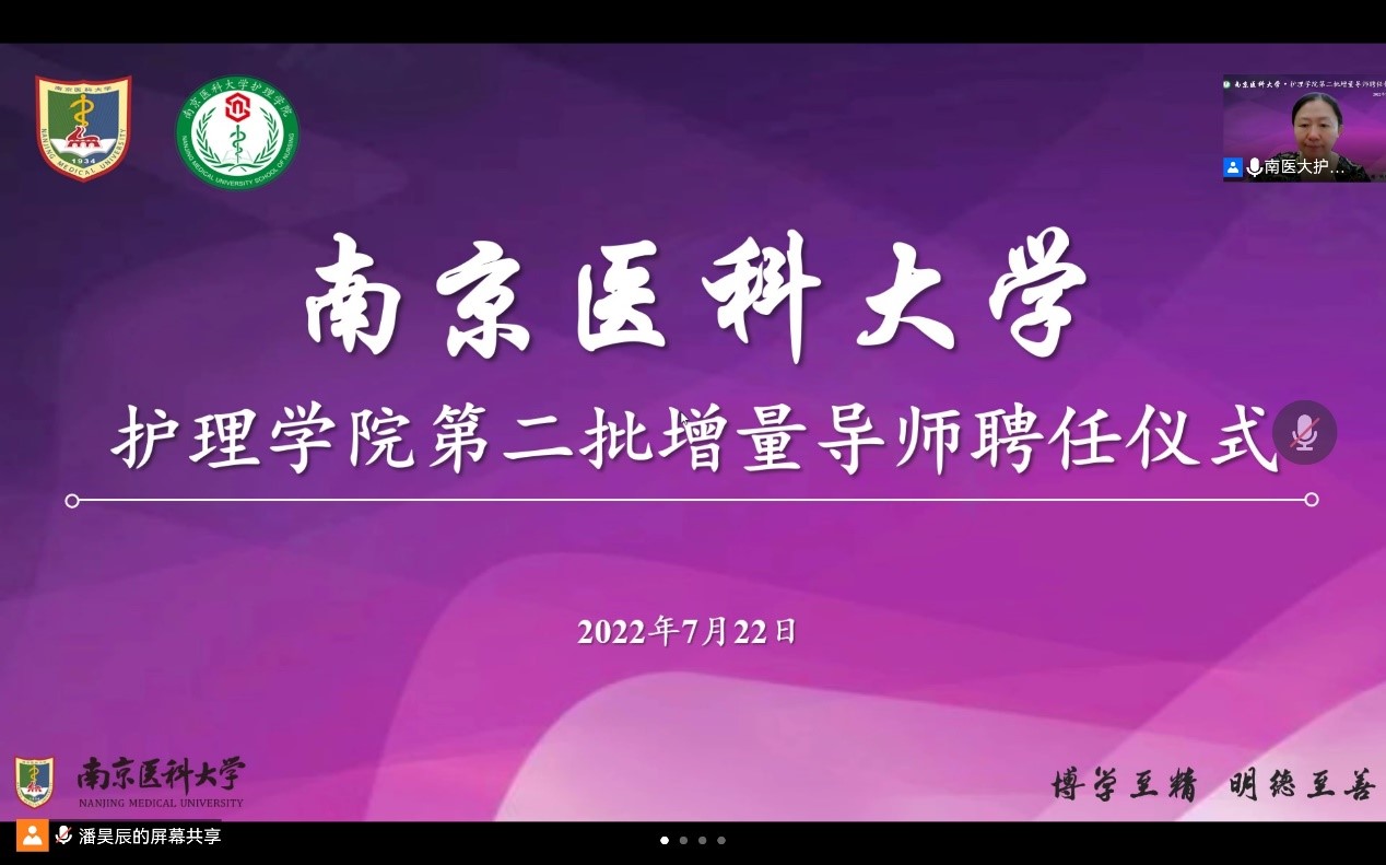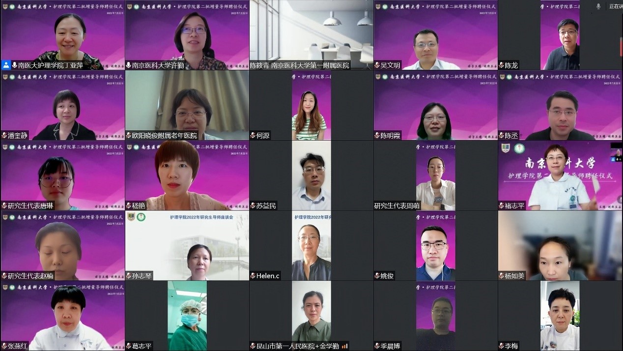 7月22日,九游娱乐(JIUYOU)官方网站_9YOU GAME第二批增量导师聘任仪式在线上顺利举行,南京医科大学研究生院吴文明副院长、研究生院培养办陈丞主任,九游娱乐(JIUYOU)官方网站_9YOU GAME陈龙书记、许勤院长、苏益民副书记、丁亚萍副院长,各学系主任,全体增量导师和研究生代表参与了此次聘任仪式。仪式由丁亚萍副院长主持。