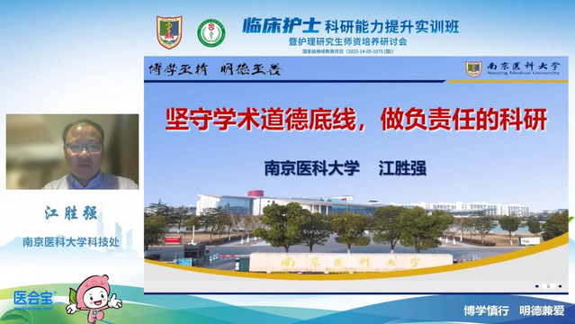 南京医科大学科技处江胜强副处长以《坚守学术道德底线,做负责任的科研》为题,明确学术道德规范的要求及不端行为的定义,从国家政策、学校文件等,围绕研究到发表的过程,梳理医学科研诚信和相关行为规范,分析学术不端行为案例。