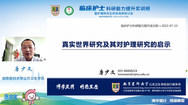 南京医科大学公共卫生学院唐少文教授以《真实世界研究及其对护理研究的启示》为题,从临床研究和护理研究的概念入手,通过流行病学研究的分类,结合随机对照研究,引入真实世界研究,结合文献详细介绍了常见真实世界研究设计,阐述了真实世界研究对护理研究的启示。