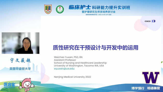 美国华盛顿大学宇文薇超副教授以《质性研究在干预设计与开发中的运用》为题,从家庭照护者及其健康问题引出所在团队的移动护理项目,介绍了以人为中心的设计、研发和测试过程,结合团队实例,辨析了质性研究内容分析的三种方法。