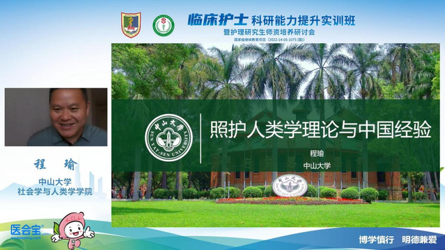 中山大学社会学与人类学学院程瑜教授以《照护人类学理论与中国经验》为题,阐述了人类学是什么、护理为什么需要人类学,引出照护人类学的学科范畴,分享了照护人类学的理论与视角、照护人类学的中国实践。