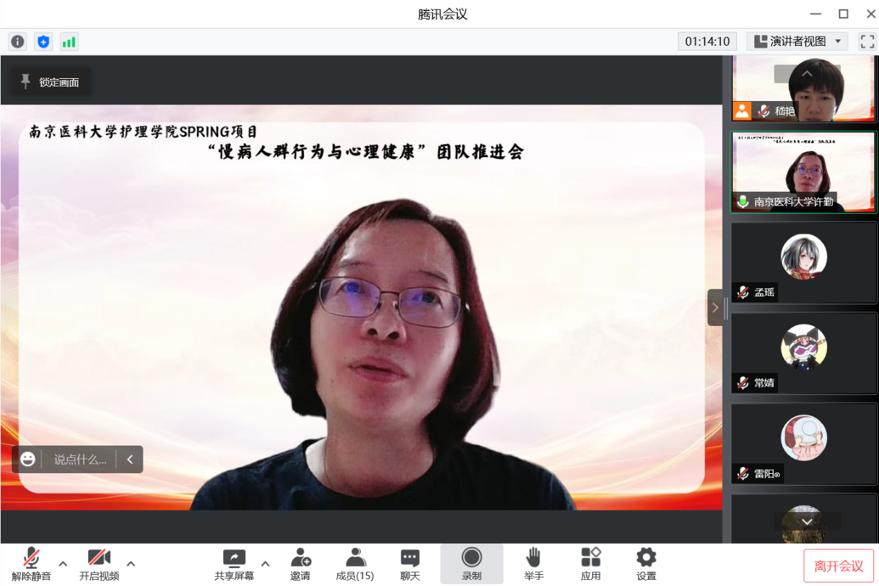 2022年7月27日,我院SPRING科研创新团队-慢病人群行为与心理健康,在线上顺利召开团队建设推进会,九游娱乐(JIUYOU)官方网站_9YOU GAME院长许勤教授、团队指导老师林征教授及团队全体师生参加会议,会议由团队项目负责人嵇艳副教授主持。