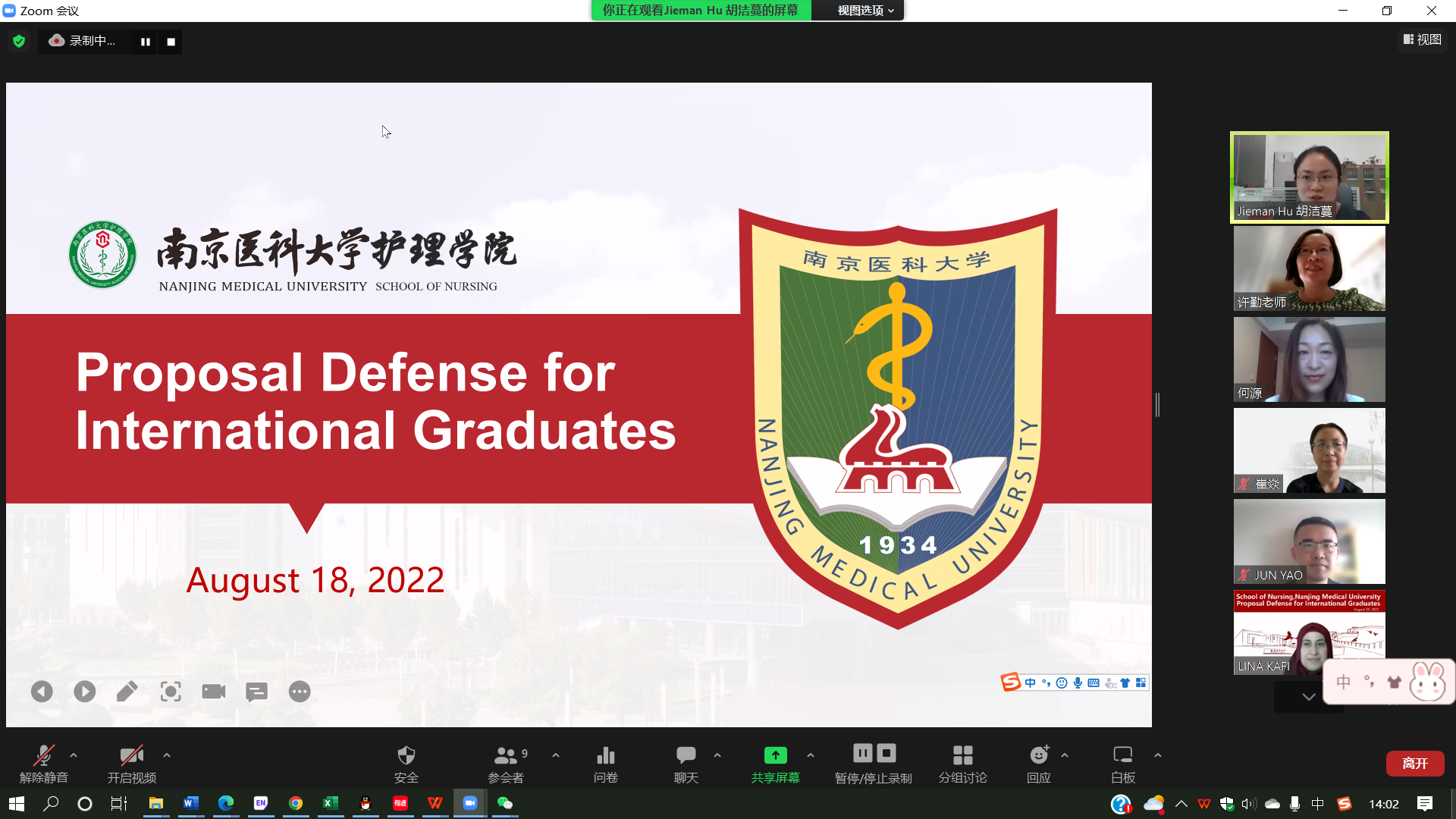 8月18日下午,九游娱乐(JIUYOU)官方网站_9YOU GAME2022年博士留学生开题报告会于线上顺利举行。本次开题报告会邀请到南京医科大学医政学院姚俊教授、马克思主义学院何源教授,九游娱乐(JIUYOU)官方网站_9YOU GAME崔焱教授作为评审专家,九游娱乐(JIUYOU)官方网站_9YOU GAME临床护理学系胡洁蔓老师担任秘书。九游娱乐(JIUYOU)官方网站_9YOU GAME博士生导师许勤教授及学科办相关负责老师参与了此次报告会。