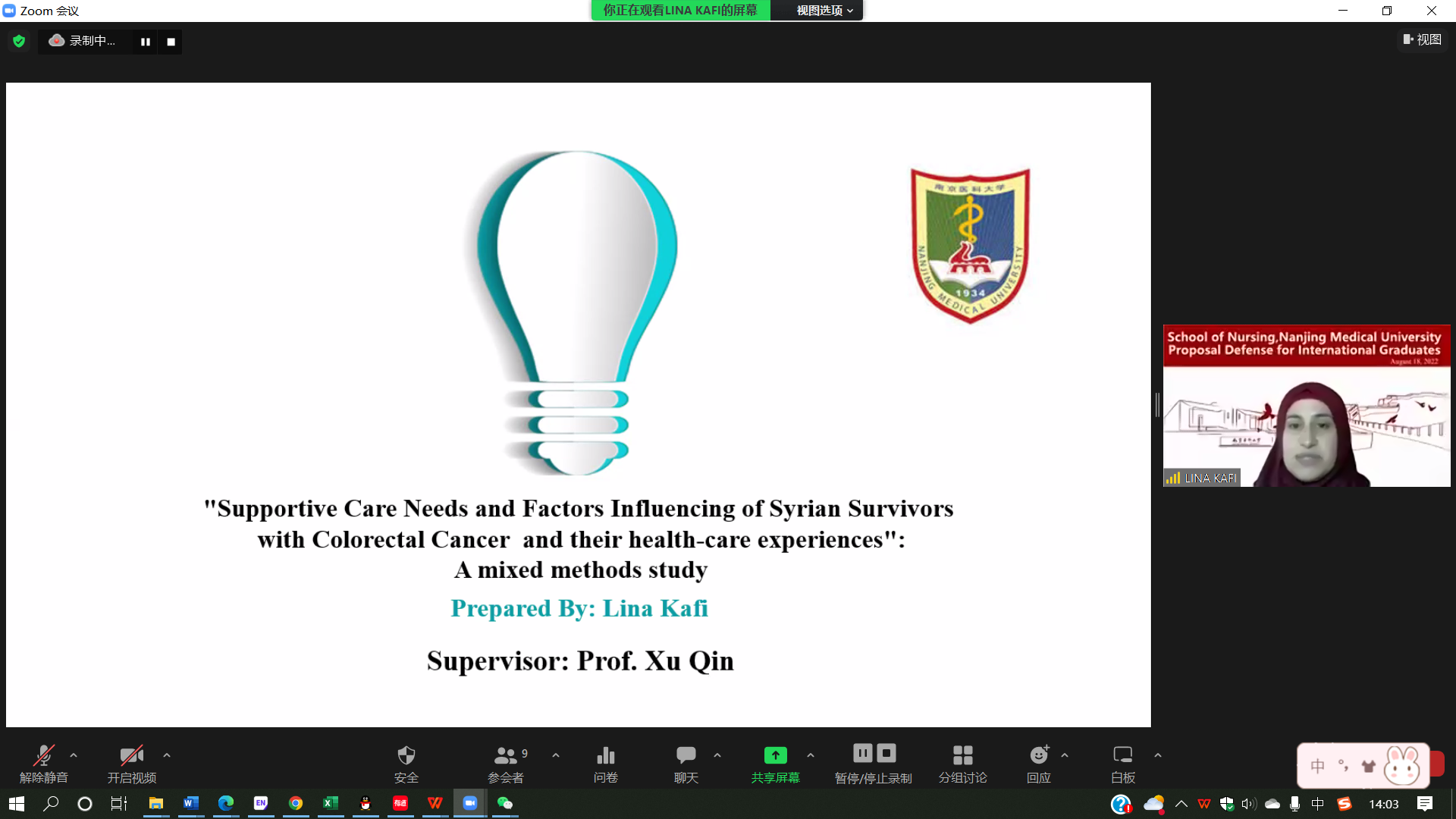 来自叙利亚的2021级博士研究生Lina Kafi汇报了题为“Supportive Care Needs and Factors Influencing of Syrian Survivors with Colorectal Cancer and their health-care experiences: A mixed methods study”的研究计划。各位评审专家充分肯定了该项目的研究意义,并就理论框架的选择、研究目的阐述、调查问卷的设计、研究的创新价值等方面展开讨论,针对开题报告中存在的具体问题提出建议和指导。经开题评审专家评议讨论,一致同意Lina Kafi通过开题答辩,并要求根据意见修改完善开题报告,确保课题的严谨性和科学性。