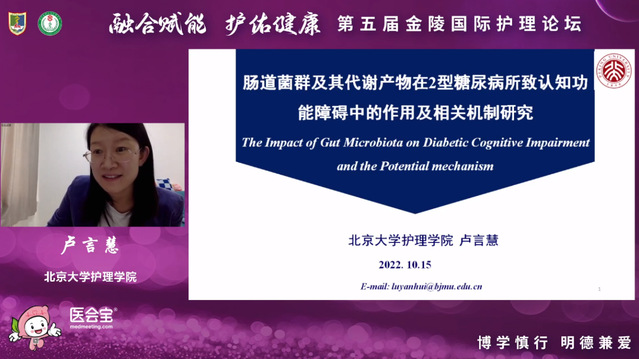 澳大利亚查尔斯达尔文大学研究生院院长、循证实践中心联合主任谭景予教授分享了《以证据为基础的传统功法锻炼对于乳腺癌患者疲劳-失眠-抑郁症状群及生存质量的影响:阶段Ⅱ随机对照试验》,谭教授基于自己课题组研究,阐明了中国传统功法对于癌症症状群患者的影响效果,系统介绍了其课题组从研究缘起到项目开发的研究步骤,对于研究生设计干预性研究,尤其是复杂干预的干预性研究有极强的帮助。北京大学九游娱乐(JIUYOU)官方网站_9YOU GAME卢言慧博士以《肠道菌群及其代谢产物在2型糖尿病所致认知功能障碍中的作用及相关机制研究》为题,从2型糖尿病发生发展的角度切入,探究了肠道菌群在2型糖尿病以及认知障碍中的作用机制,从微观角度寻找肠道菌群对认知障碍的潜在靶点。