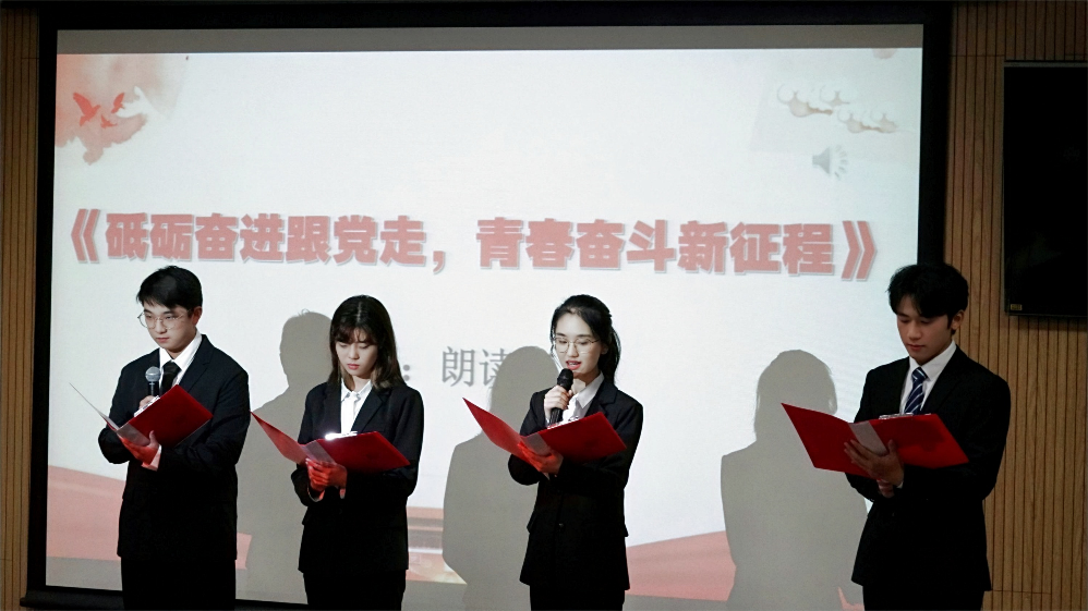 中场诗朗诵《砥砺奋进跟党走,青春奋斗新征程》由朗读亭成员表演,他们声情并茂、铿锵有力的朗诵赢得全场掌声。