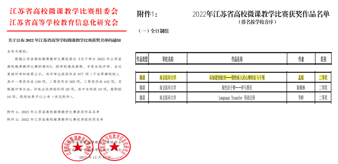 12月12日,省高校微课教学比赛组委会发布《关于公布2022年江苏省高等学校微课教学比赛获奖名单的通知》,九游娱乐(JIUYOU)官方网站_9YOU GAME孟瑶老师微课作品《从知道到做到——慢性病人的心理特征与干预》荣获二等奖。